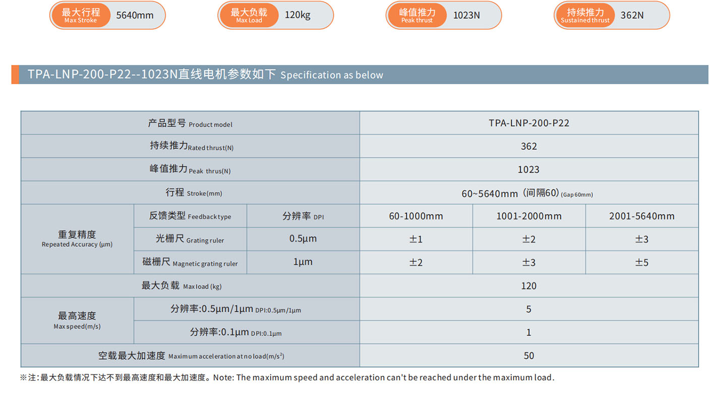 Since the LNP series linear motor cancels the mechanical contact and is directly driven by the electromagnetic, the dynamic response speed of the entire closed-loop control system is greatly improved. At the same time, since there is no transmission error caused by the mechanical transmission structure, with the linear position feedback scale (such as grating ruler, magnetic grating ruler), the LNP series linear motor can achieve micron-level positioning accuracy, and the repeat positioning accuracy can reach ±1um.