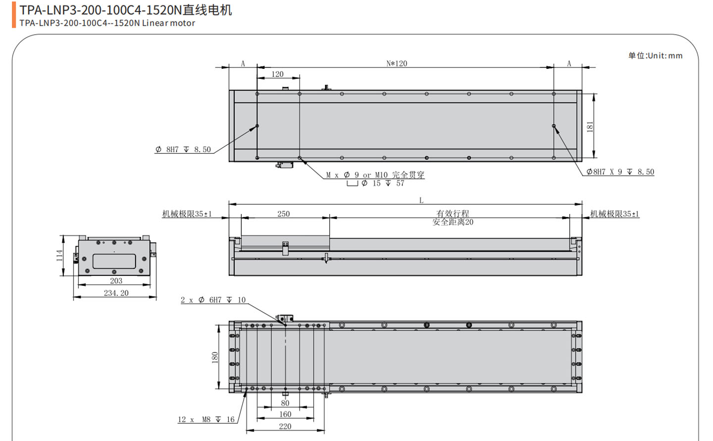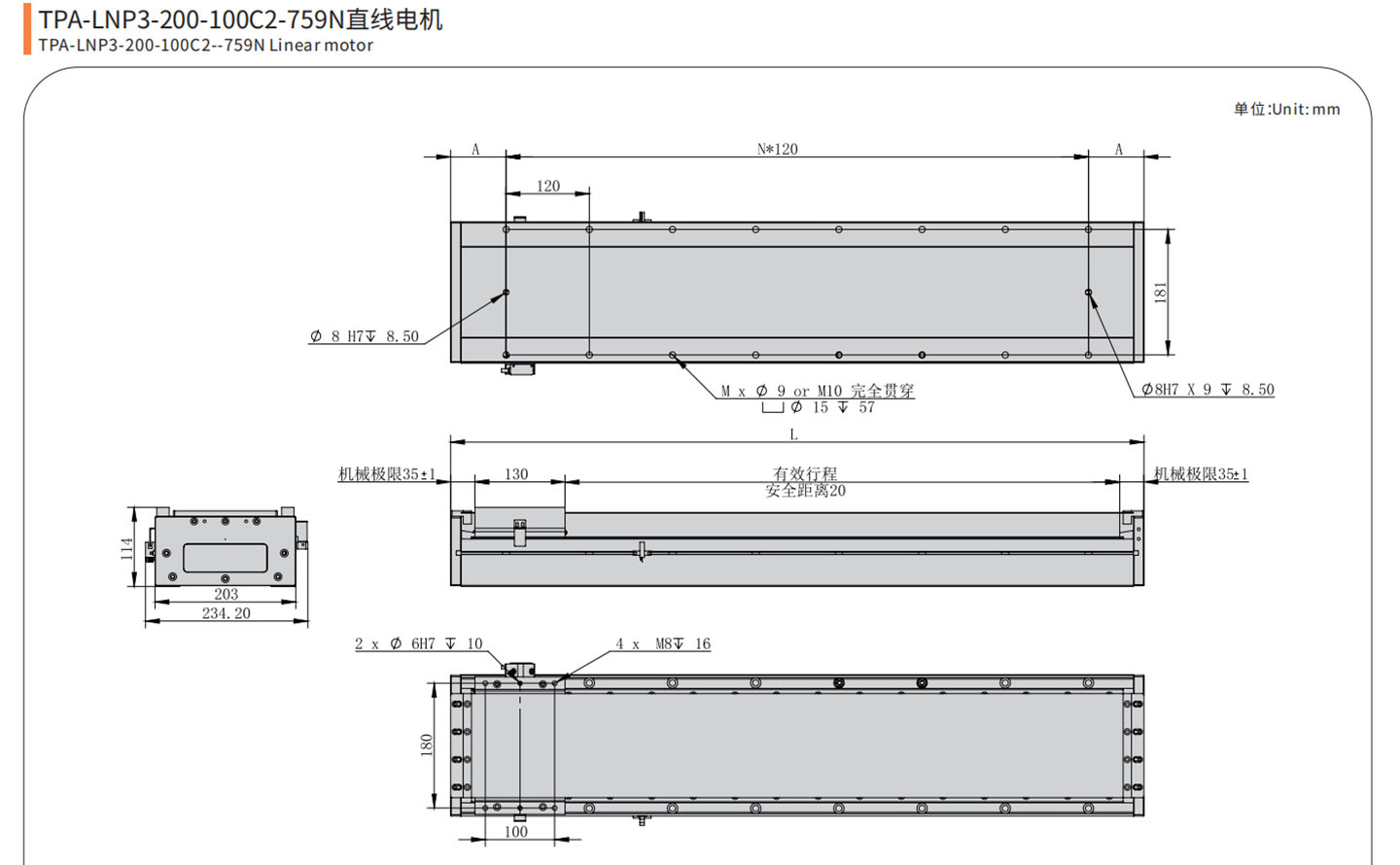 Since the LNP series linear motor cancels the mechanical contact and is directly driven by the electromagnetic, the dynamic response speed of the entire closed-loop control system is greatly improved. At the same time, since there is no transmission error caused by the mechanical transmission structure, with the linear position feedback scale (such as grating ruler, magnetic grating ruler), the LNP series linear motor can achieve micron-level positioning accuracy, and the repeat positioning accuracy can reach ±1um.