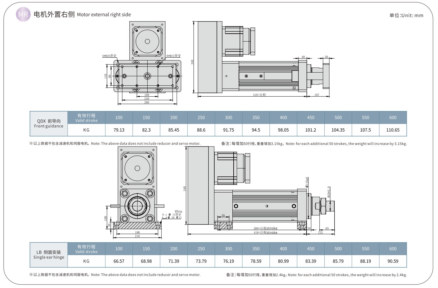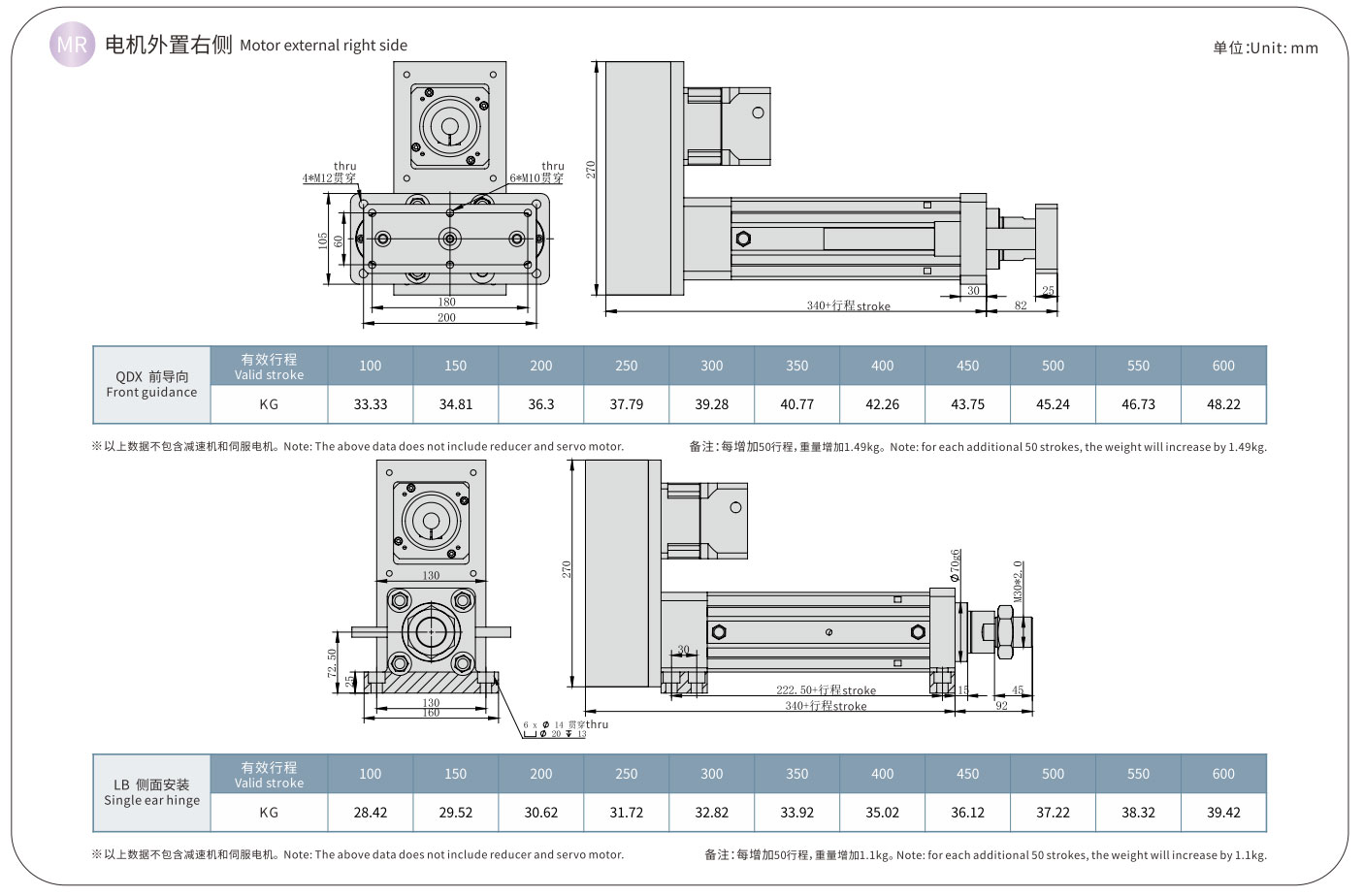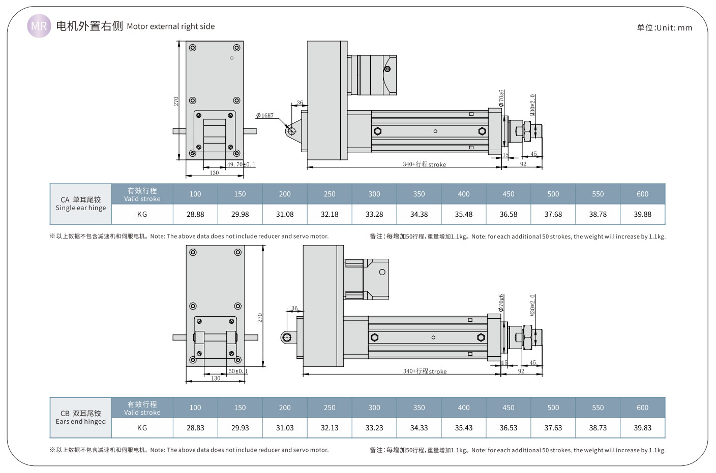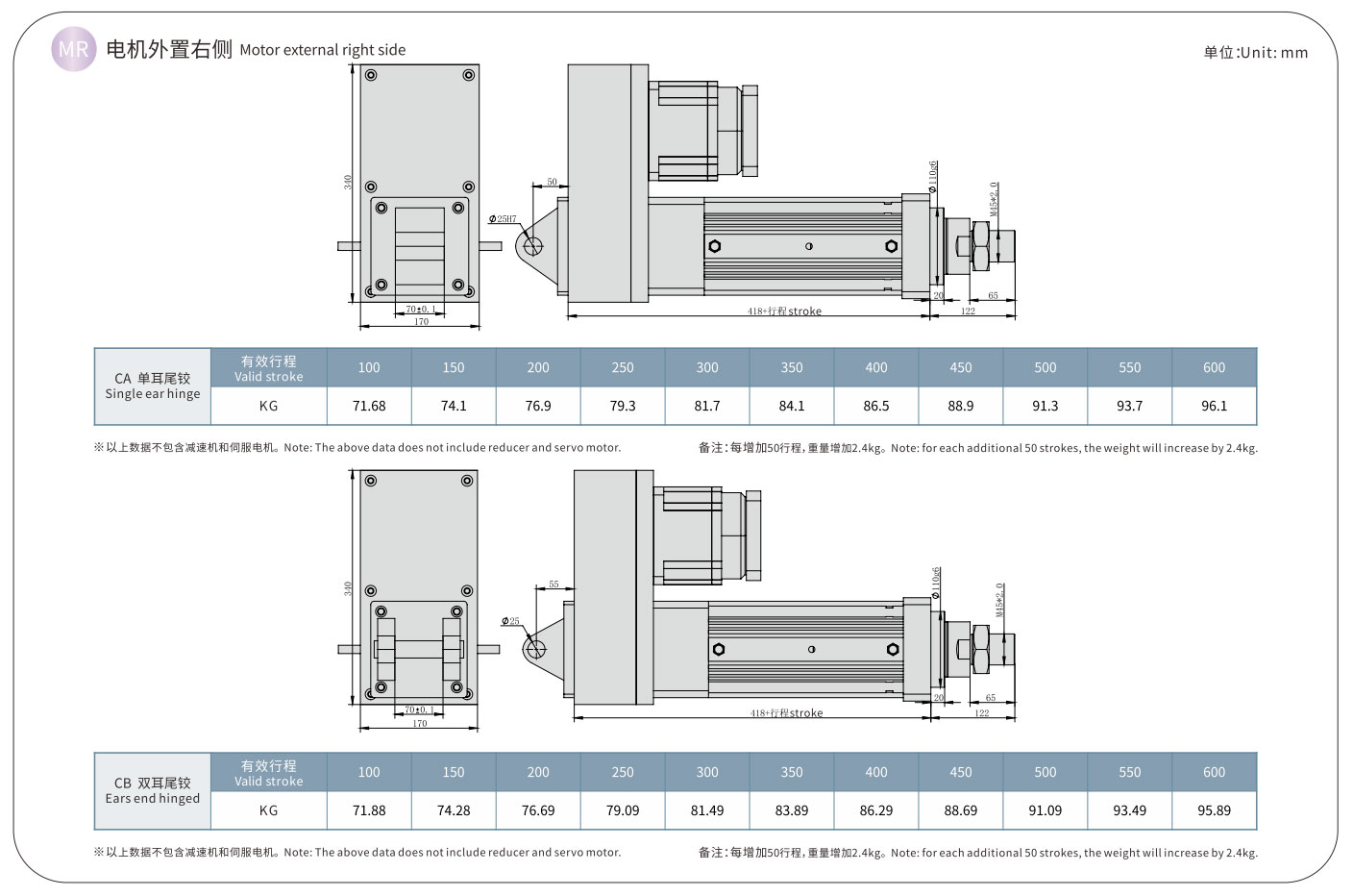 The EMR series electric actuator cylinder provides a thrust of up to 47600N and a stroke of 1600mm. It can also maintain the high precision of the servo motor and ball screw drive, and the repeat positioning accuracy can reach ±0.02mm. Only need to set and modify PLC parameters to complete precise push rod motion control. With its unique structure, the EMR electric actuator can work in complex environments. Its high power density, high transmission efficiency and long service life provide customers with a more economical solution for linear motion of the push rod, and it is easy to maintain. Only regular grease lubrication is required, saving a lot of maintenance costs.