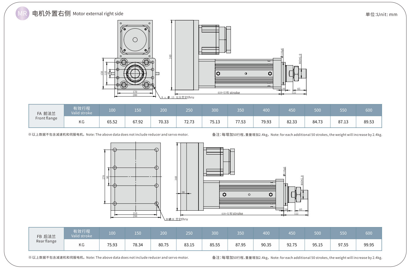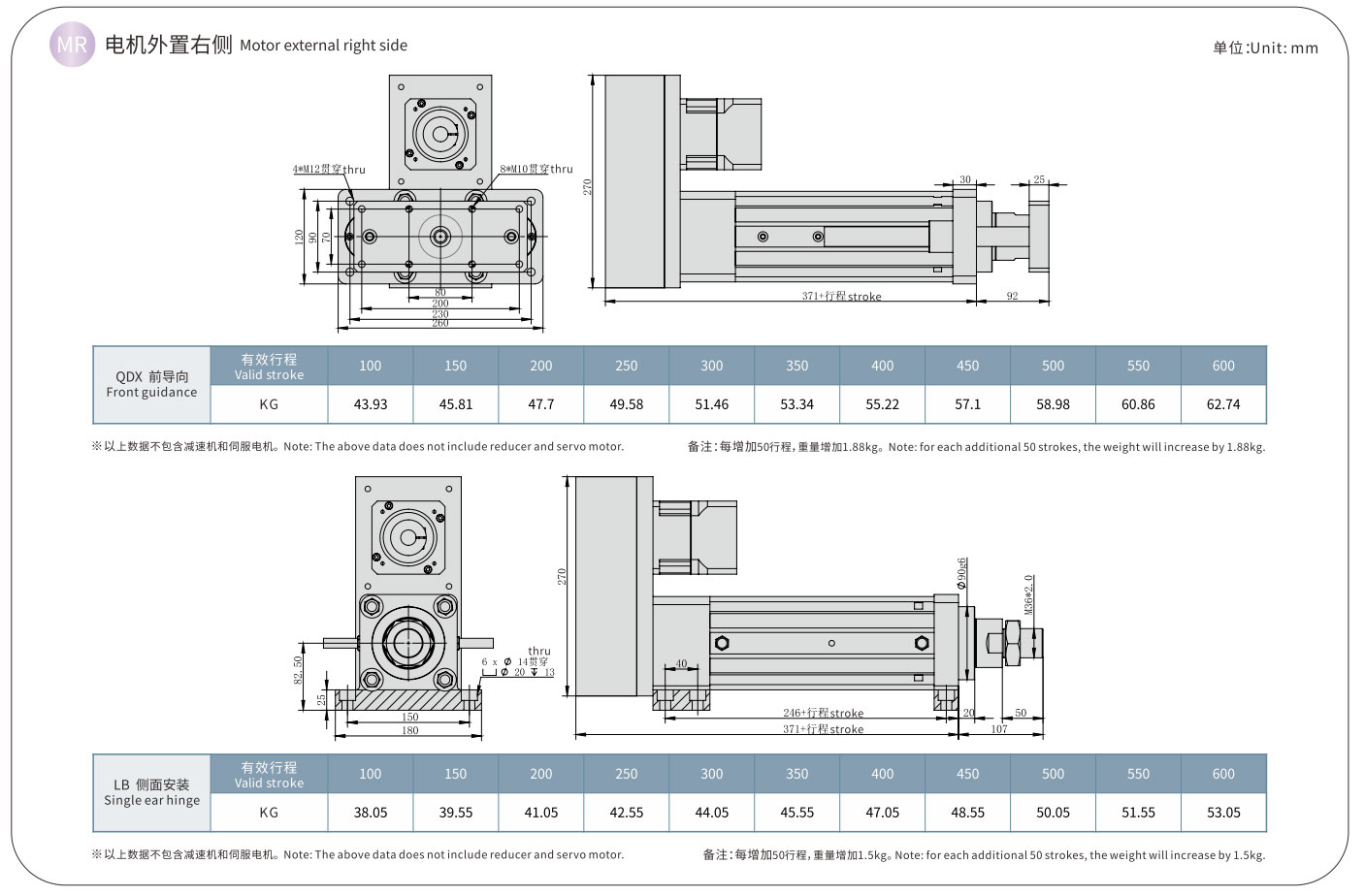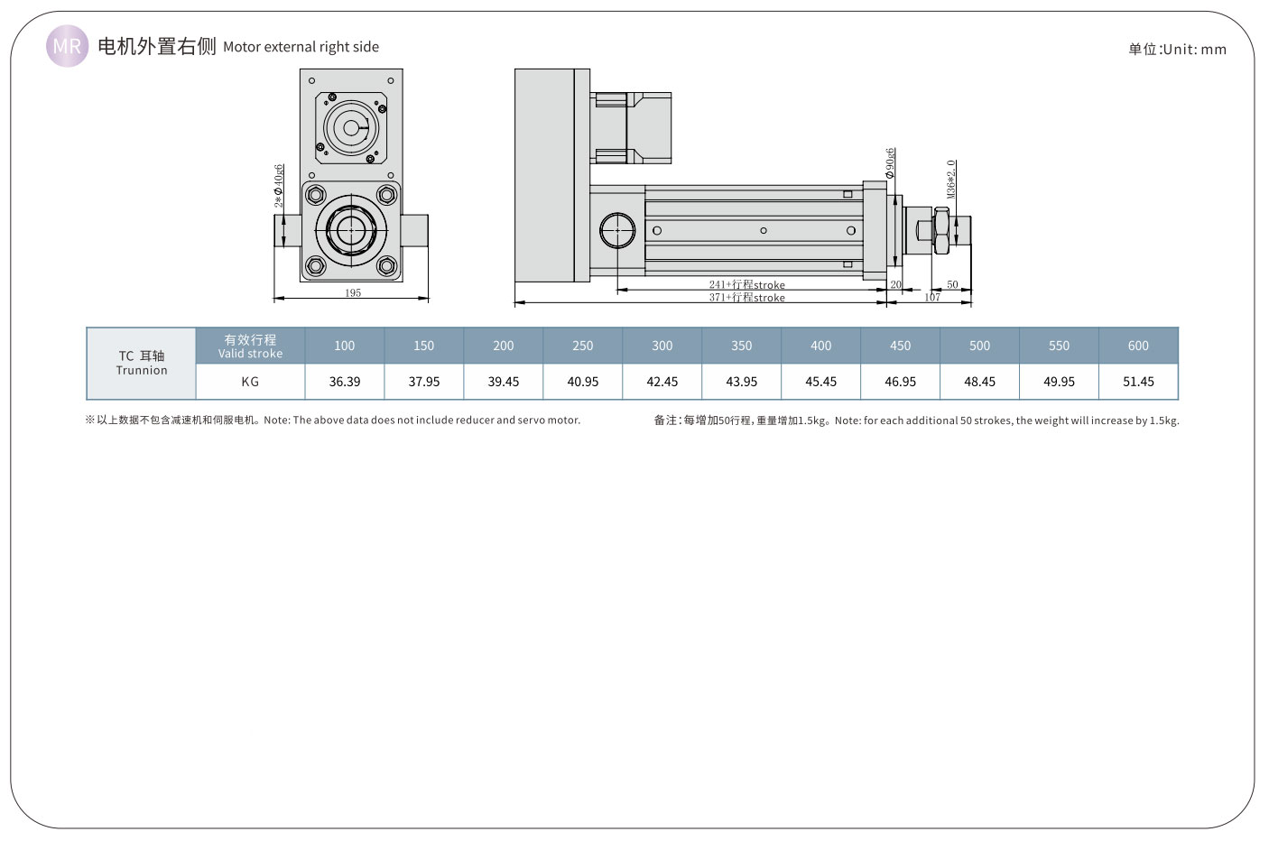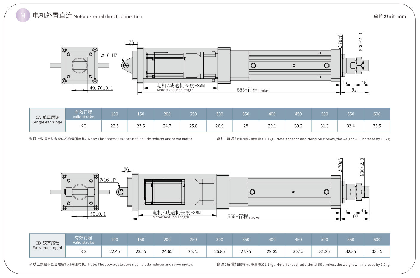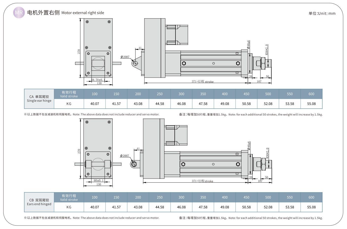 The EMR series electric actuator cylinder provides a thrust of up to 47600N and a stroke of 1600mm. It can also maintain the high precision of the servo motor and ball screw drive, and the repeat positioning accuracy can reach ±0.02mm. Only need to set and modify PLC parameters to complete precise push rod motion control. With its unique structure, the EMR electric actuator can work in complex environments. Its high power density, high transmission efficiency and long service life provide customers with a more economical solution for linear motion of the push rod, and it is easy to maintain. Only regular grease lubrication is required, saving a lot of maintenance costs.