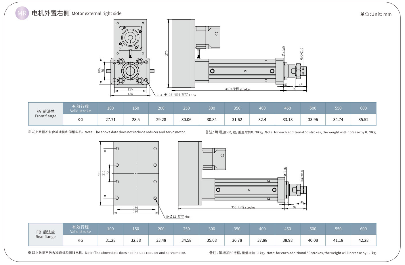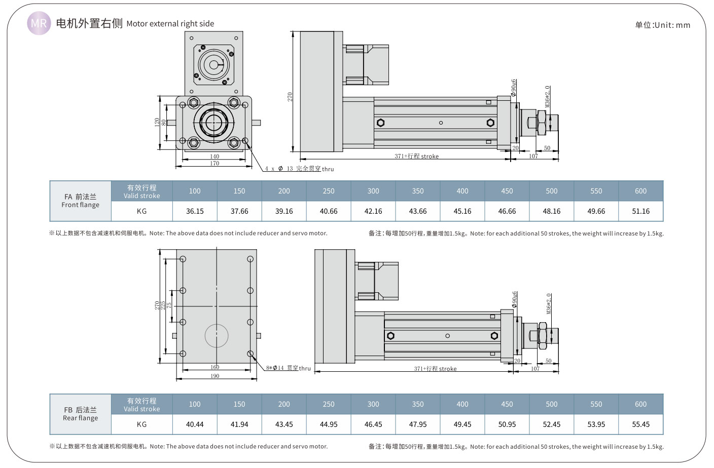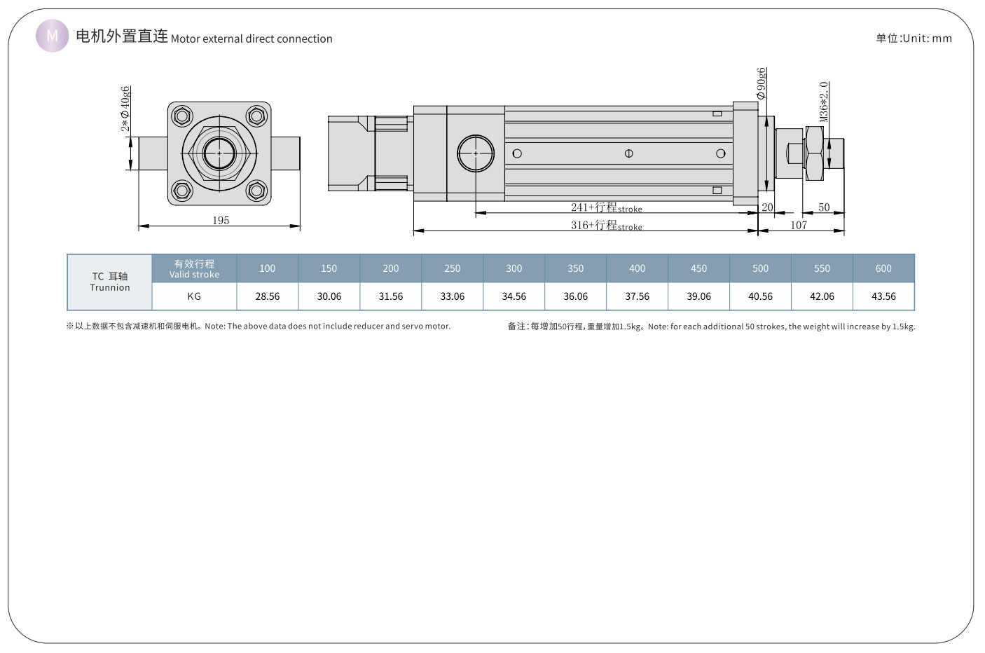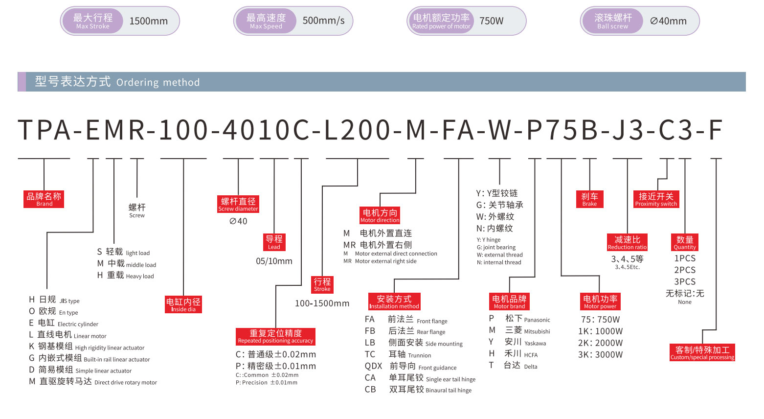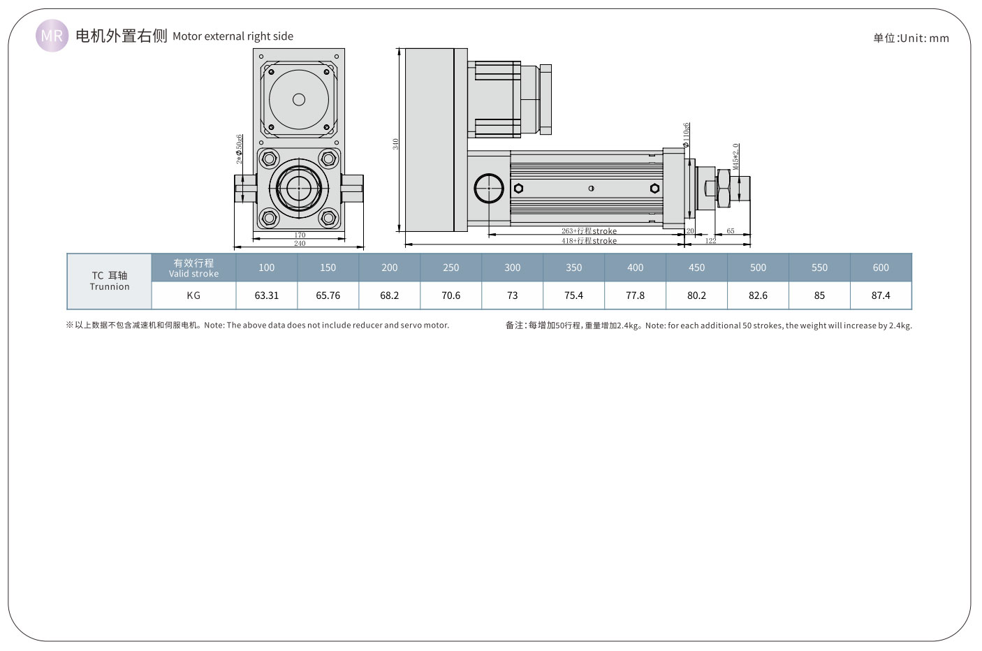 The EMR series electric actuator cylinder provides a thrust of up to 47600N and a stroke of 1600mm. It can also maintain the high precision of the servo motor and ball screw drive, and the repeat positioning accuracy can reach ±0.02mm. Only need to set and modify PLC parameters to complete precise push rod motion control. With its unique structure, the EMR electric actuator can work in complex environments. Its high power density, high transmission efficiency and long service life provide customers with a more economical solution for linear motion of the push rod, and it is easy to maintain. Only regular grease lubrication is required, saving a lot of maintenance costs.