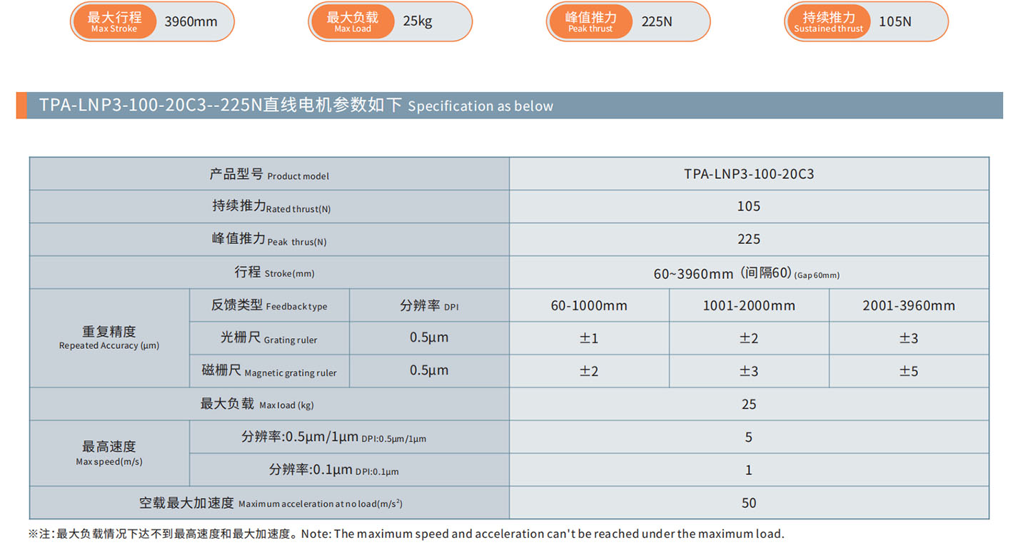 Since the LNP series linear motor cancels the mechanical contact and is directly driven by the electromagnetic, the dynamic response speed of the entire closed-loop control system is greatly improved. At the same time, since there is no transmission error caused by the mechanical transmission structure, with the linear position feedback scale (such as grating ruler, magnetic grating ruler), the LNP series linear motor can achieve micron-level positioning accuracy, and the repeat positioning accuracy can reach ±1um.